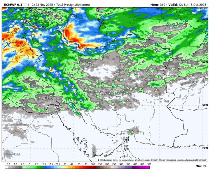خروجی‌های پیش بینی هواشناسی بر اساس مدل اروپا نشان می‌دهد در آذرماه بارش‌های گسترده و قابل توجه در نیمی از ایران رخ خواهد داد.