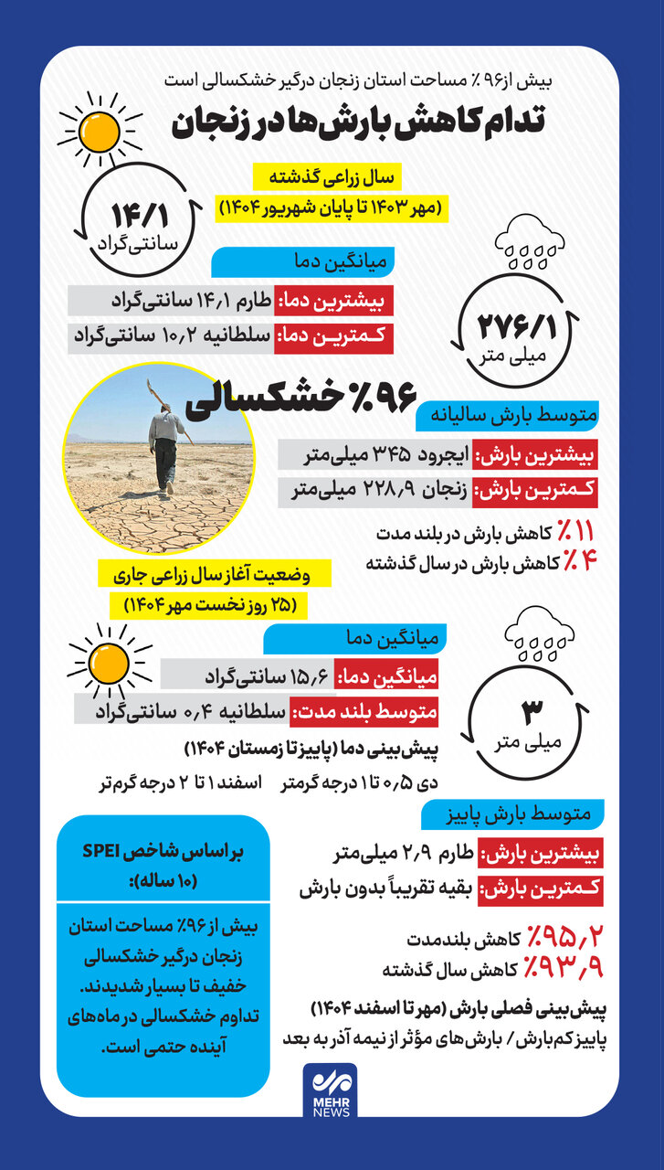 زنجان - زنجانی ها امسال پاییز و زمستان نسبتا کم بارشی را تجربه خواهند کرد و دمای هوا نیز نسبت به مدت مشابه سال گذشته کاهش خواهد بود.