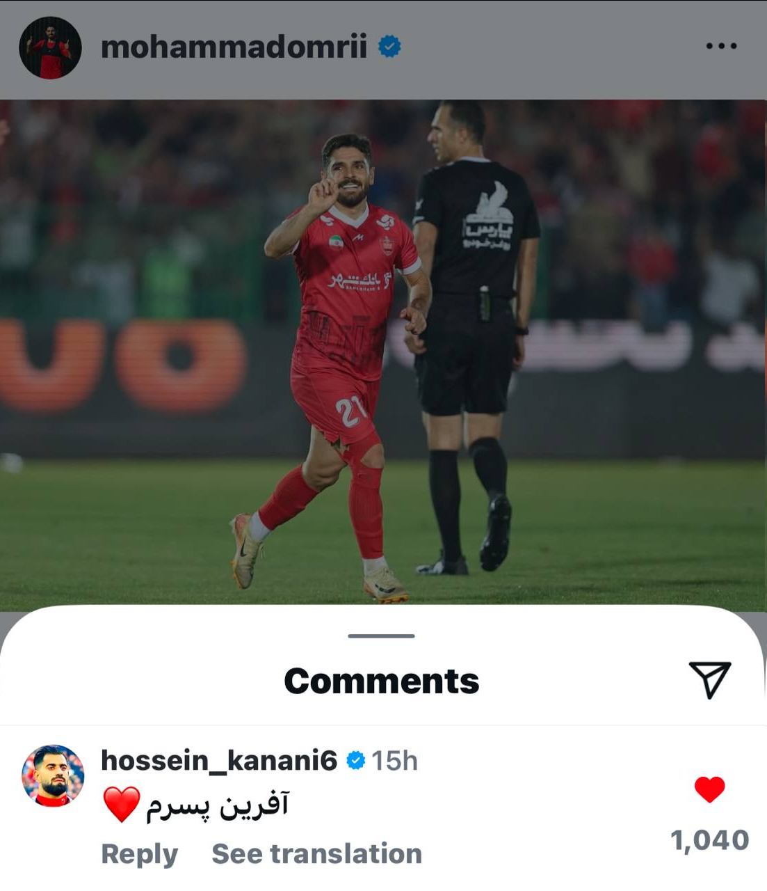 در این میان، یکی از کامنتهایی که خیلی زود مورد توجه کاربران قرار گرفت، مربوط به حسین کنعانیزادگان بود. مدافع ملیپوش پرسپولیس در واکنشی صمیمی زیر پست همتیمیاش نوشت: «آفرین پسرم».