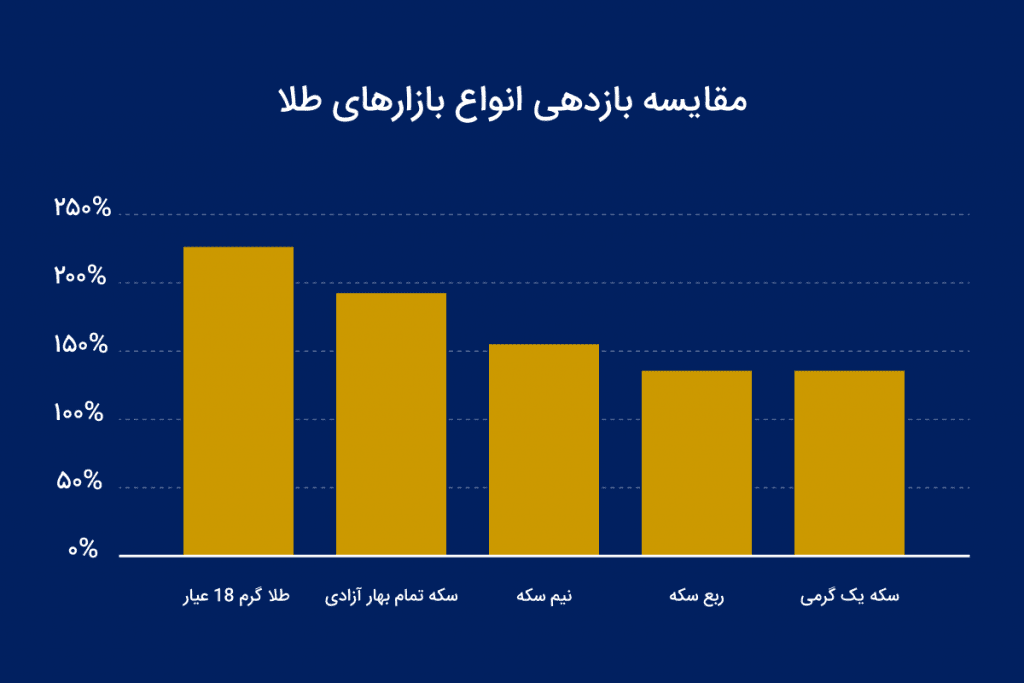 در ادامه مقایسه بازدهی بازارها، نگاهی دقیقتر به درون بازار طلا نشان میدهد که طلای آبشده در سال گذشته بیشترین بازدهی را در مقایسه با انواع سکههای طلا داشته است.