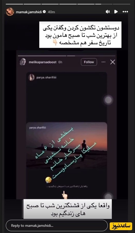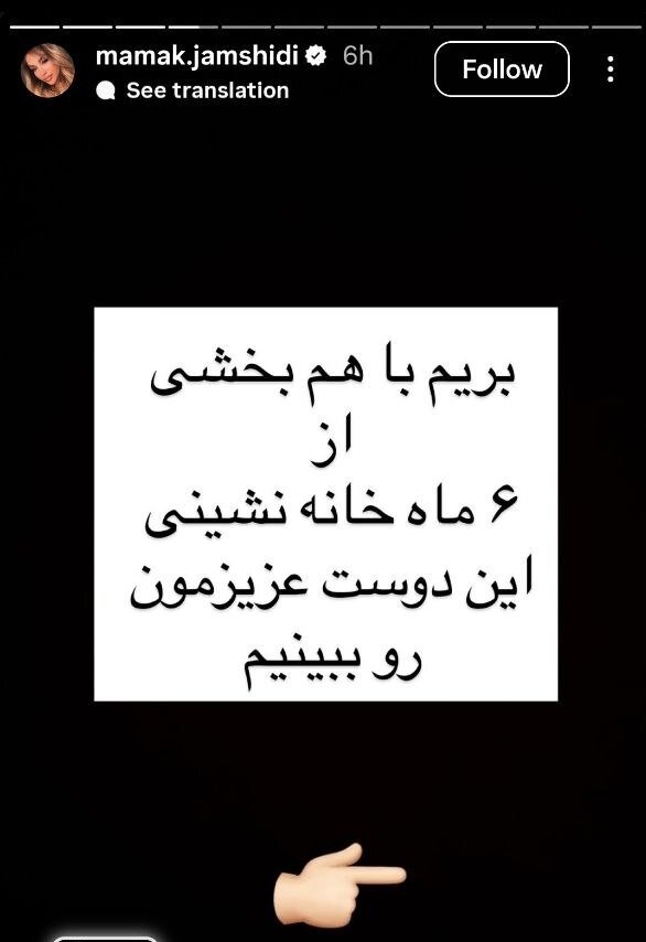 مامک جمشیدی با انتشار چند استوری از صفحه شاکی پرونده اشاره کرده است: «بریم با هم بخشی از ۶ ماه خانه نشینی این دوست عزیزمون رو ببینیم»