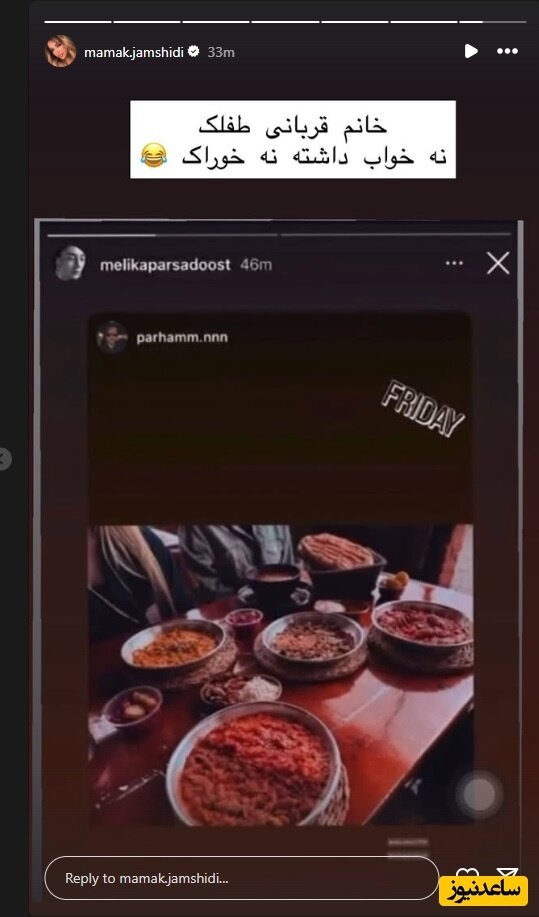 به گزارش همشهری آنلاین به نقل از عصرایران مامک جمشیدی خواهر پژمان جمشیدی چند استوری درباره شاکی پرونده منتشر کرده و در یکی از آنها نوشته است: «خانم قربانی طفلک نه خواب داشته نه خوراک».