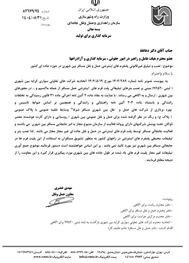 نامهای که از سوی معاون اول رئیس جمهور منتشر شد، ابهاماتی داشت که باعث تفاسیر مختلف شد. پس از آن، معاون وزیر اصلاحیهای بر همان نامه زد و اعلام کرد که در واقع وزارت راه نقش «مجوزدهی» ندارد، بلکه نقش «تنظیمگری» را ایفا میکند. از سوی دیگر، وزارت راه و سازمان راهداری گفتند که قرار است فرآیند مجوزدهی از سوی آنها انجام شود، و حتی از کلیدواژههایی استفاده میکنند مانند «قیمتگذاری دستوری» و «رعایت حقوق مسافران»؛ در حالی که در حال حاضر چنین سازوکاری در وزارت راه وجود ندارد.
