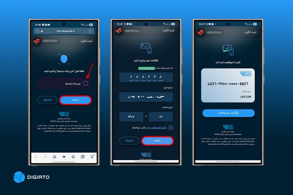 روند کلی در هر سه سرویس مشابه است، ابتدا کارت را اضافه میکنید، تطبیق کد ملی و شماره تلفن انجام میشود و سپس از تأیید پیامکی را دریافت میکنید.