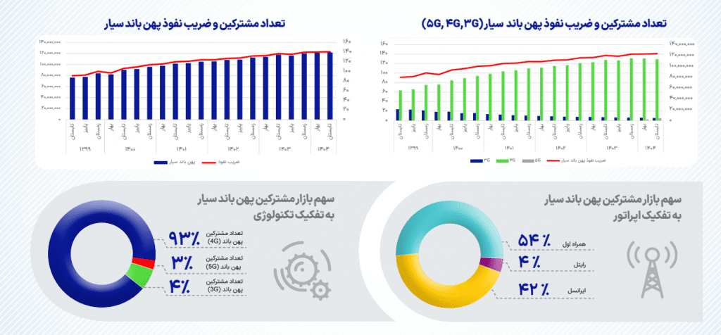 آمار رشد مشترکین پهن باند سیار نیز مثبت بوده است؛ به عبارتی مشترکین پهن باند سیار به ۱۲۱ میلیون و ۸۱۸ هزار و ۸۵۰ نفر رسیده است که خبر از رشد ۳.۵۷ درصدی نسبت به تابستان ۱۴۰۳ میدهد. در ضریب نفوذ پهن باند سیار نیز شاهد رشد ۲.۸۶ درصدی هستیم.
