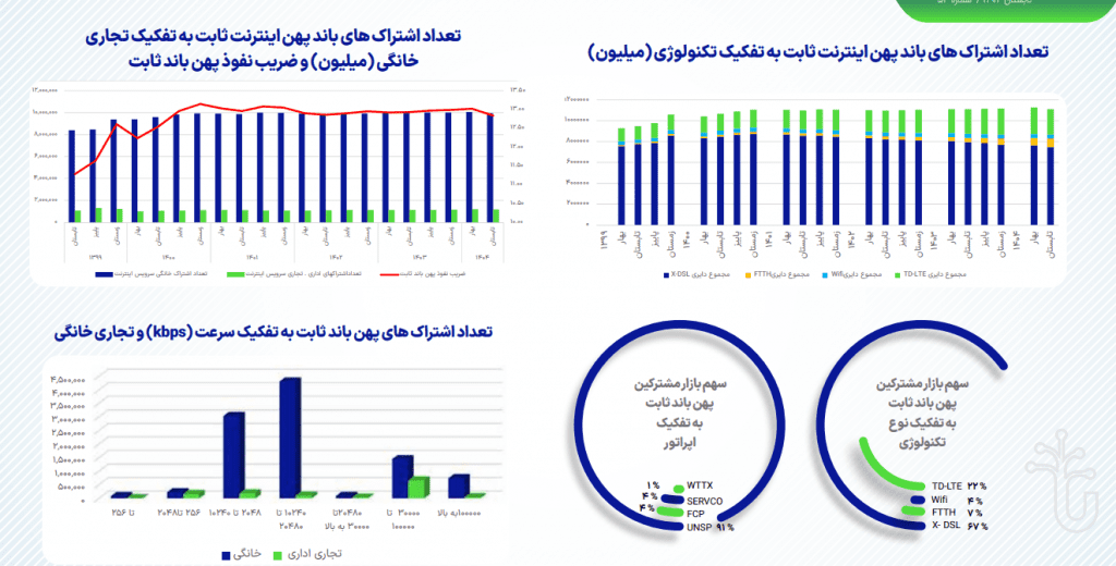در سهم بازار مشترکین پهن باند ثابت به تفکیک نوع تکنولوژی همچنان X-DSL و TD-LTE به ترتیب با ۶۷ و ۲۲ درصد پیشتاز هستند و سهم کاربران FTTH (فیبرنوری) نیز بدون تغییر همان ۷ درصد باقی مانده است.