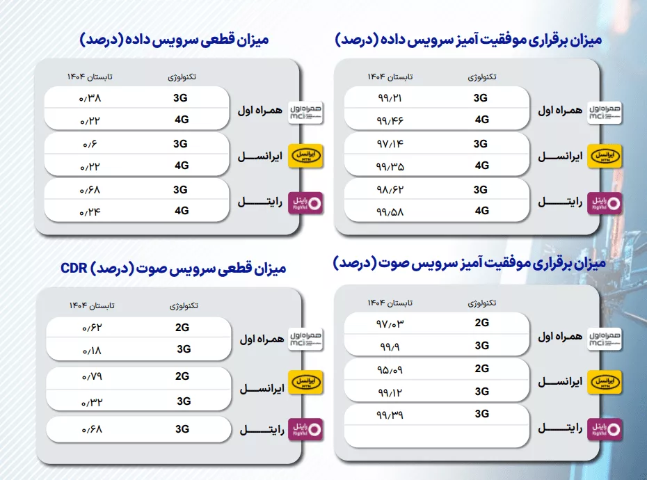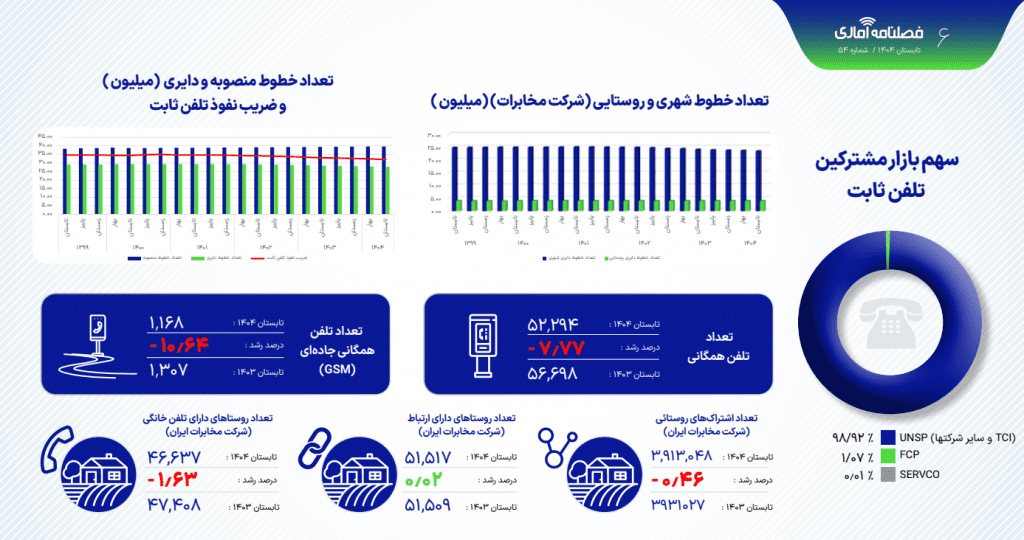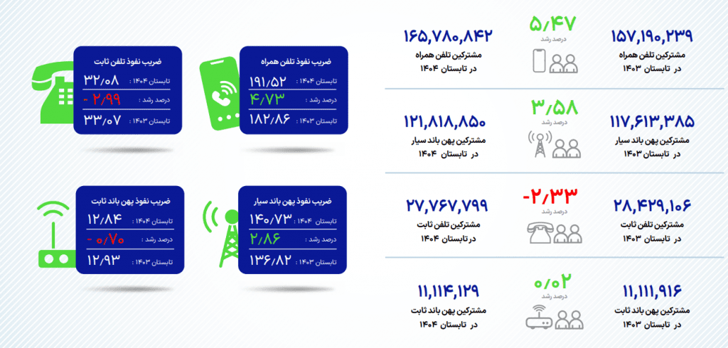 جدیدترین فصلنامه آماری سازمان تنظیم مقررات و ارتباطات رادیویی از عملکرد حوزه ارتباطات کشور در تابستان ۱۴۰۴، رشد تعداد مشترکین تلفن همراه و پهن باند سیار و تداوم کاهش مشترکین تلفن ثابت را نشان میدهد. تعداد مشترکین پهن باند ثابت نیز با وجود تبلیغات و تلاشهای گسترده وزارت ارتباطات، رشد زیادی نکرده است.