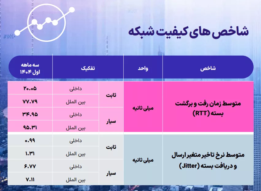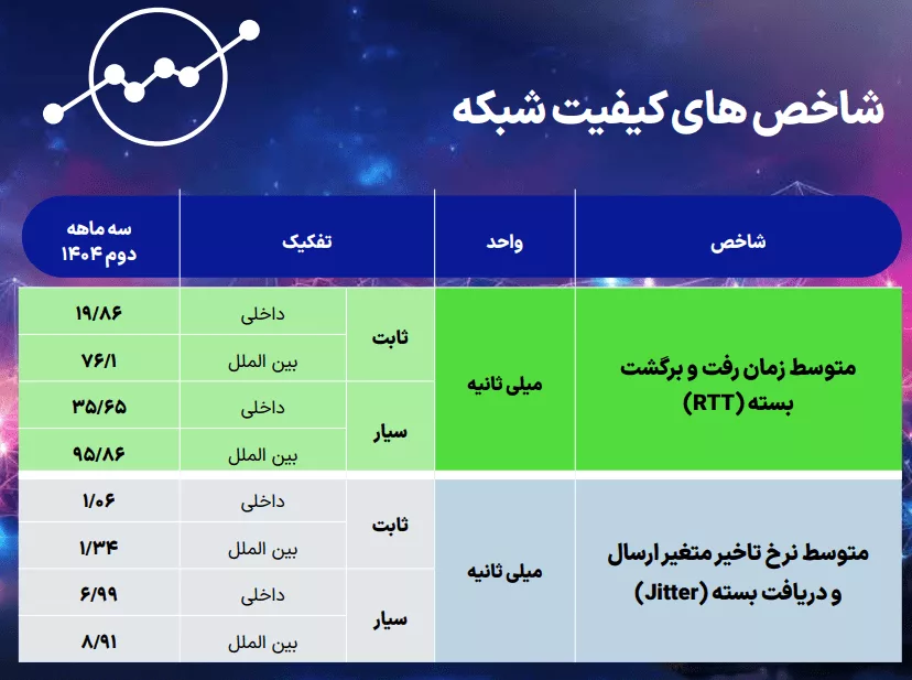 بررسی شاخصهای کیفیت شبکه در سهماهه دوم ۱۴۰۴ نشان میدهد عملکرد شبکه نسبت به دوره قبل اندکی بهبود یافته است. بر اساس آمار منتشرشده، میانگین زمان رفتوبرگشت بسته (RTT) در اینترنت ثابت داخلی از ۲۰.۰۵ به ۱۹.۸۶ میلیثانیه کاهش یافته و در بخش بینالملل نیز از ۷۷.۷۹ به ۷۶.۱ میلیثانیه رسیده است. در اینترنت سیار، RTT داخلی با افزایش جزئی از ۳۴.۹۵ به ۳۵.۶۵ میلیثانیه رسیده، اما RTT بینالملل از ۹۵.۳۱ به ۹۵.۸۶ میلیثانیه تغییر کرده است.