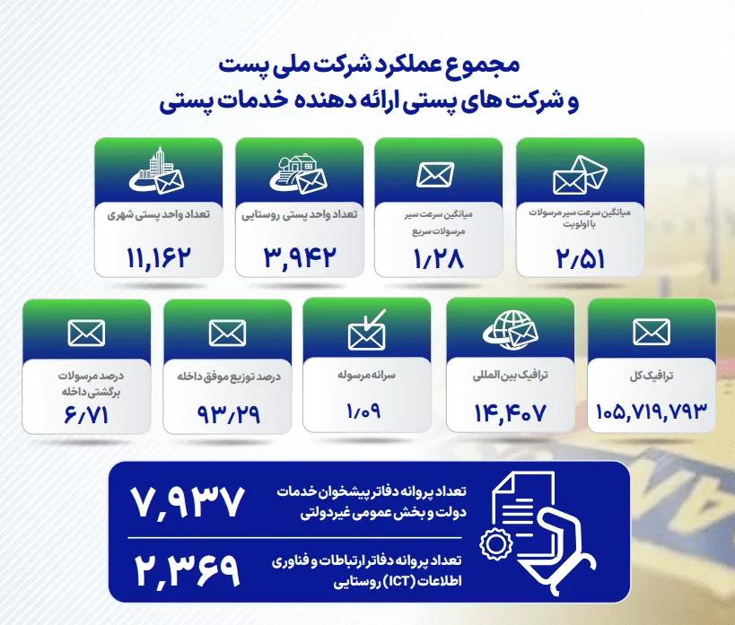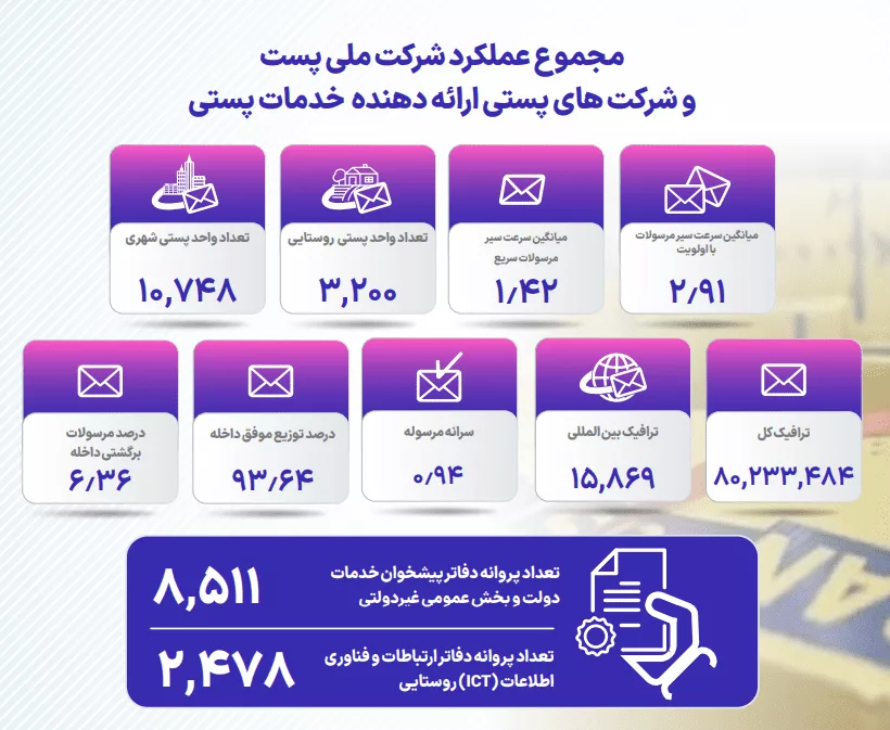 در بخش دیگری از این گزارش به رشد شرکت پست نیز اشاره شده است. در سه ماه اول سال ۱۴۰۴ ترافیک کل شرکت پست ۸۰ میلیون و ۲۳۳ هزار و ۴۸۴ است. این آمار در سه ماه دوم سال ۱۴۰۴ به ۱۰۵ میلیون و ۷۱۹ هزار و ۷۹۳ رسیده است.