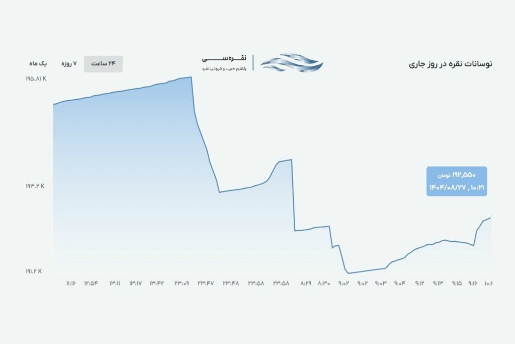 در هفته آخر آبان ۱۴۰۴ (از ۲۰ تا ۲۷ آبان)، قیمت هر گرم نقره ۹۹۹ در بازار ایران روندی صعودی ملایم داشت و از حدود ۲۰۸,۴۳۰ تومان (۲,۰۸۴,۳۰۰ ریال) در ۲۰ آبان به ۲۱۲,۴۷۰ تومان (۲,۱۲۴,۷۰۰ ریال) در ۲۶ آبان رسید که افزایش حدود ۱.۹۲ درصدی را نشان میدهد؛ این رشد عمدتا به دلیل صعود اونس جهانی از ۵۱ به ۵۲.۵۳ دلار و ثبات نسبی نرخ دلار آزاد بود. با این حال، نوسانات جزئی کاهشی در اواخر هفته به دلیل انتظارات مذاکرات اقتصادی مشاهده شد.