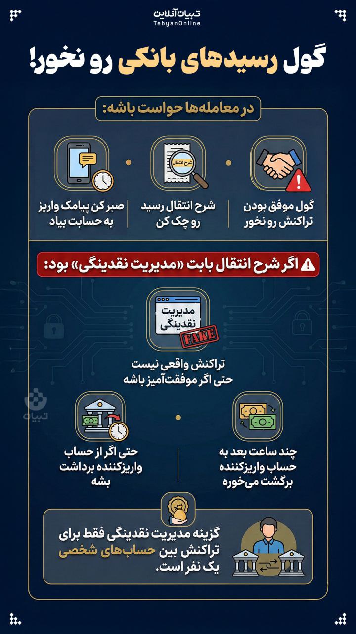 رسید بانکی الزاماً به‌معنای «انجام نهایی تراکنش» نیست. خطاهای سیستمی، قطعی شبکه یا برگشت خودکار می‌تواند باعث شود پولی جابه‌جا نشود، حتی اگر رسید داشته باشید. همیشه وضعیت نهایی حساب را بررسی کنید، نه فقط رسید را.