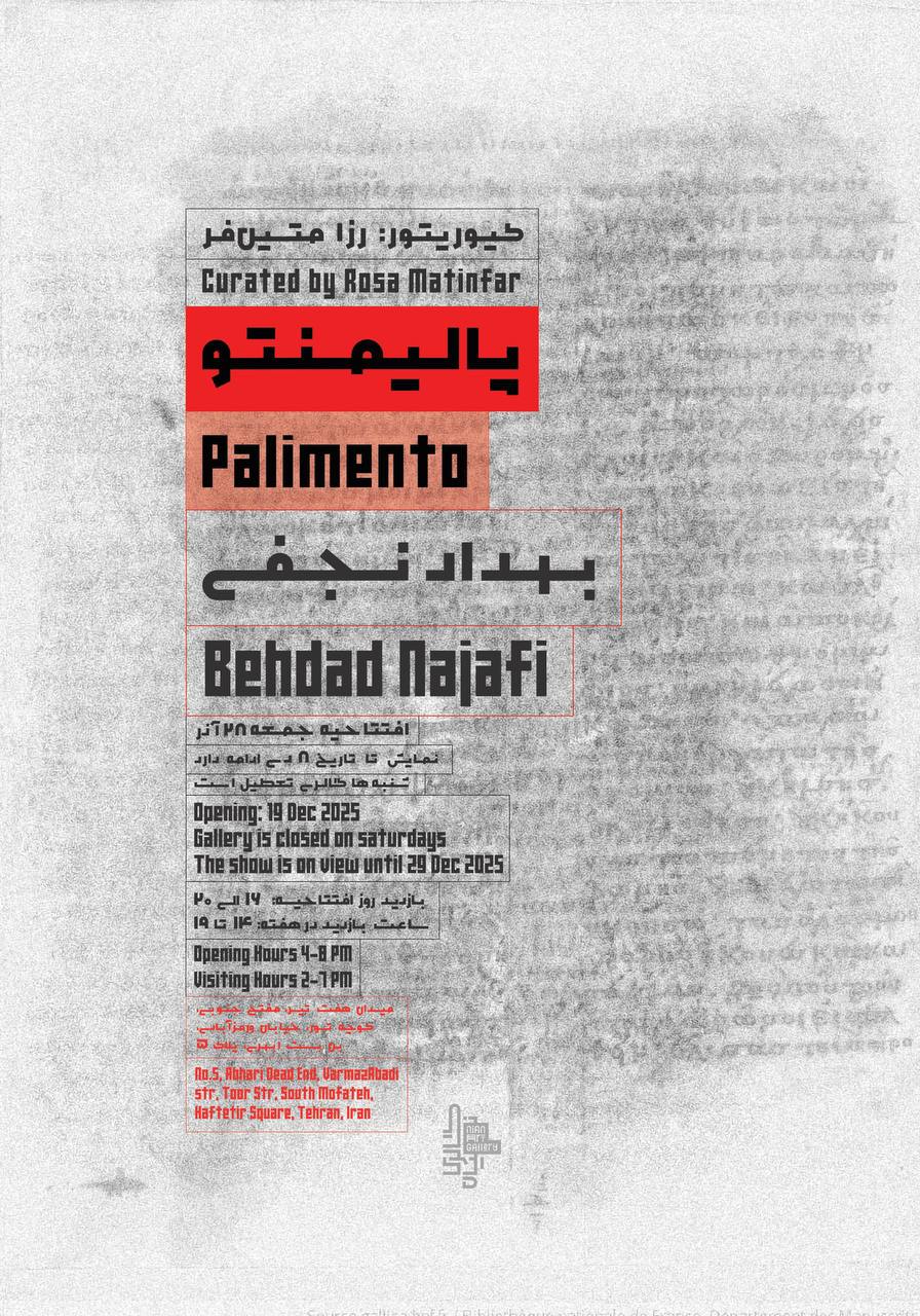 نمایشگاه «پالیمنتو» با نمایش آثاری از بهداد نجفی اسدالهی نقاش و هنرمند رسانه های نوین هنری با کیوریتوری رزا متین‌فر ، از ۲۸ آذر ۱۴۰۴ به مدت ۱۰ روز پذیرای علاقمندان است.
