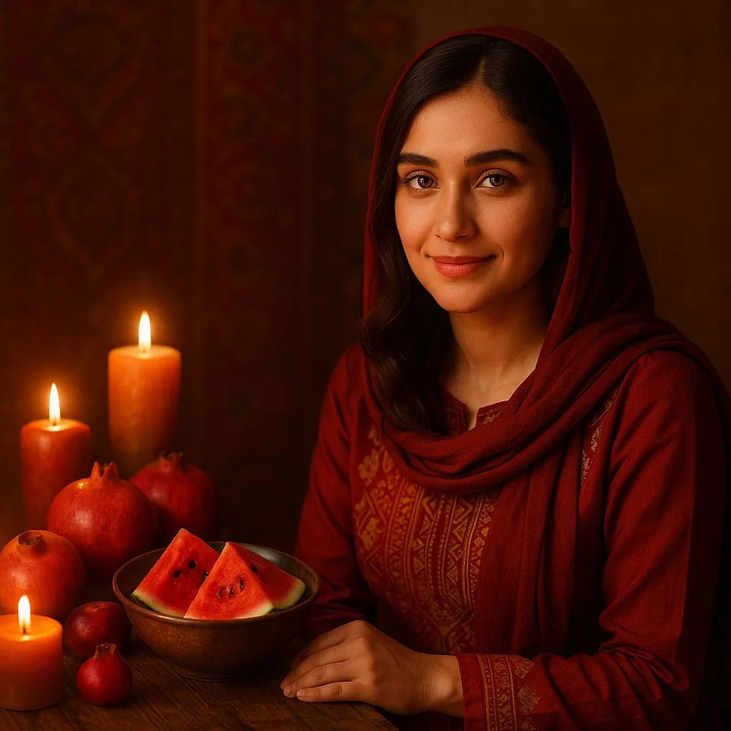 A natural Persian Yalda Night portrait of a young woman sitting beside a traditional Yalda table with pomegranates, candles, and a bowl of fresh watermelon. Warm soft lighting, red-and-gold color palette, Persian patterns in background, realistic DSLR style, 85mm lens, shallow depth of field, winter cozy mood.