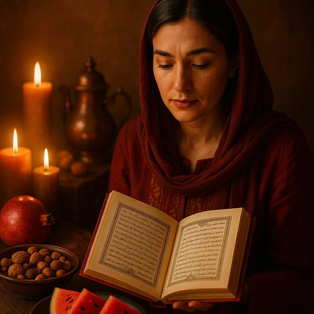 A realistic Yalda Night portrait of a Persian woman holding an open Hafez book, surrounded by candles, nuts, watermelon slices, and a copper samovar. Cinematic lighting, warm tones, detailed skin texture, 50mm f/1.4 lens.