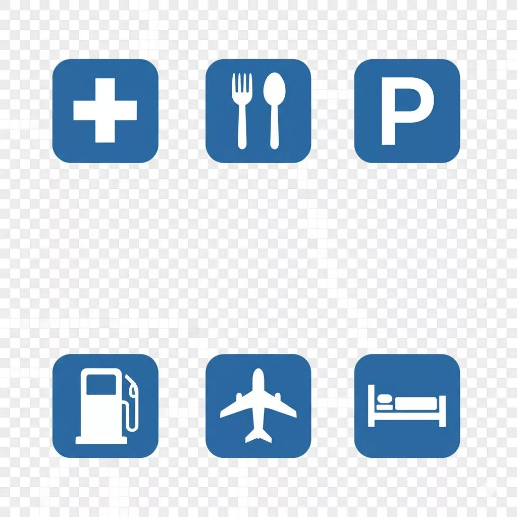 Design a universal map icon set for navigation and public spaces, including hospital, restaurant, parking, gas station, airport and hotel icons. Simple symbolic shapes with high contrast and clear recognition. Flat style, rounded corners, transparent background. Optimized for maps and small-scale display.