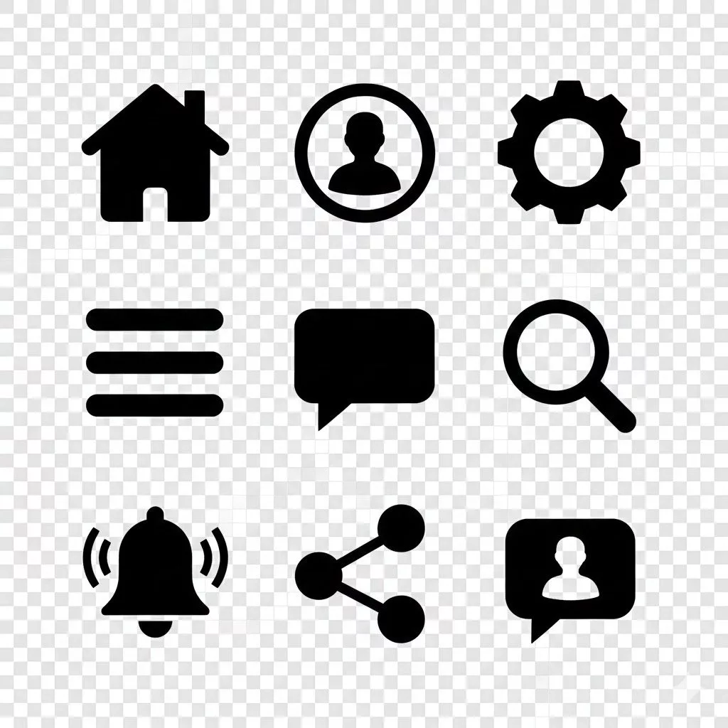 Generate a filled glyph-style icon set for modern applications. Solid shapes with balanced negative space, no outlines. Icons for menu, profile, settings, messages and social media. Transparent background, pixel-perfect and visually consistent design.
