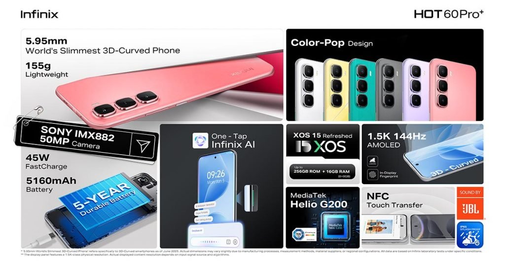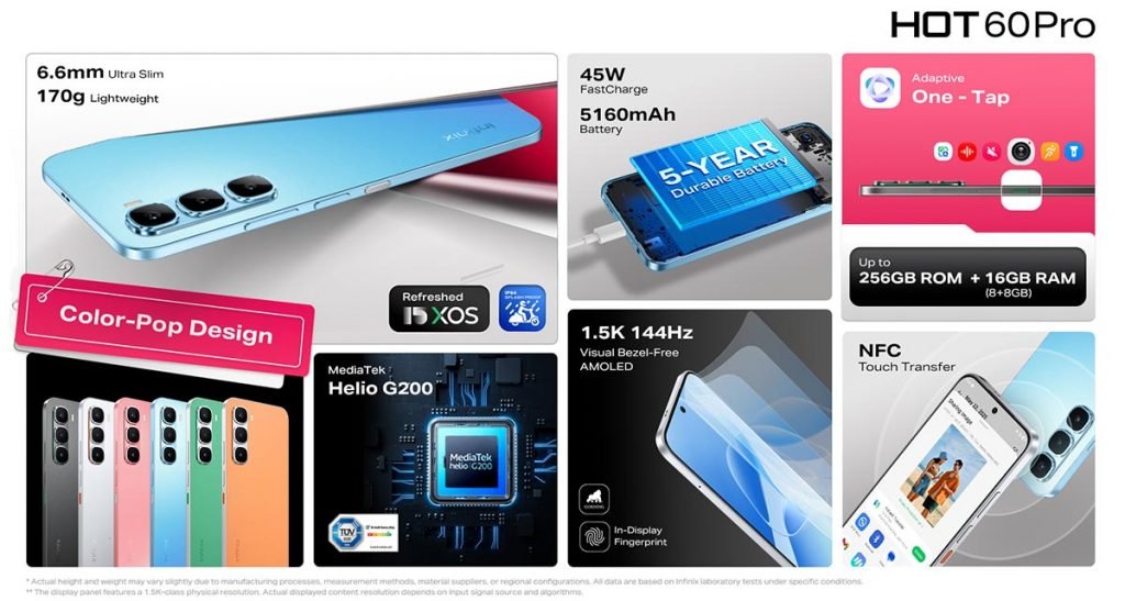 Infinix HOT 60 Pro+ یکی از جدیدترین مدل‌های سری HOT است که می‌خواهد تجربه‌ای فراتر از یک گوشی ساده ارائه دهد، بدون آن‌که قیمت را به سطح میان‌رده‌های بالاتر برساند. این گوشی طراحی ظریف و وزن سبک (تنها ۱۵۵ گرم) دارد.