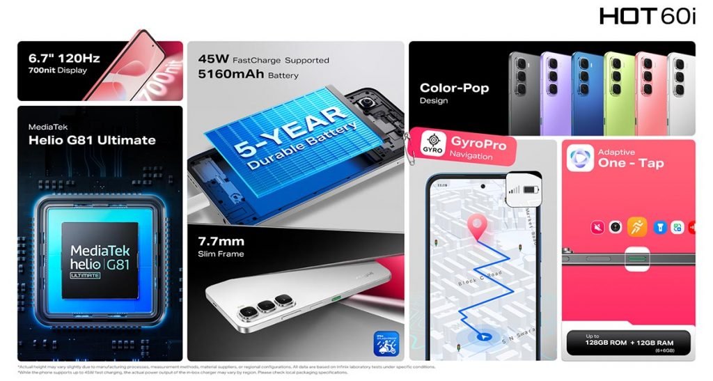 Infinix HOT 60i 4G نسخه‌ای دیگر از سری HOT است که با تمرکز بر نیازهای پایه و استفاده‌های روزمره اقتصادی طراحی شده است. این مدل صفحه‌نمایشی 6.7 اینچی IPS LCD با نرخ نوسازی ۱۲۰ هرتز دارد؛ ترکیبی که با وجود وضوح HD+، پیمایش روان و تجربه مناسب برای استفاده‌های اجتماعی و تماشای محتوا فراهم می‌کند.