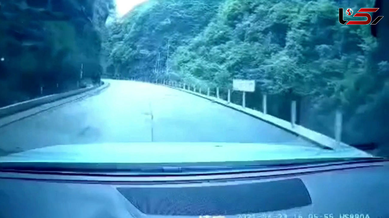 پدر و پسر چینی که با ماشین در جادهای کوهستانی حرکت میکردند از حادثه ریزش کوه نجات یافتند.