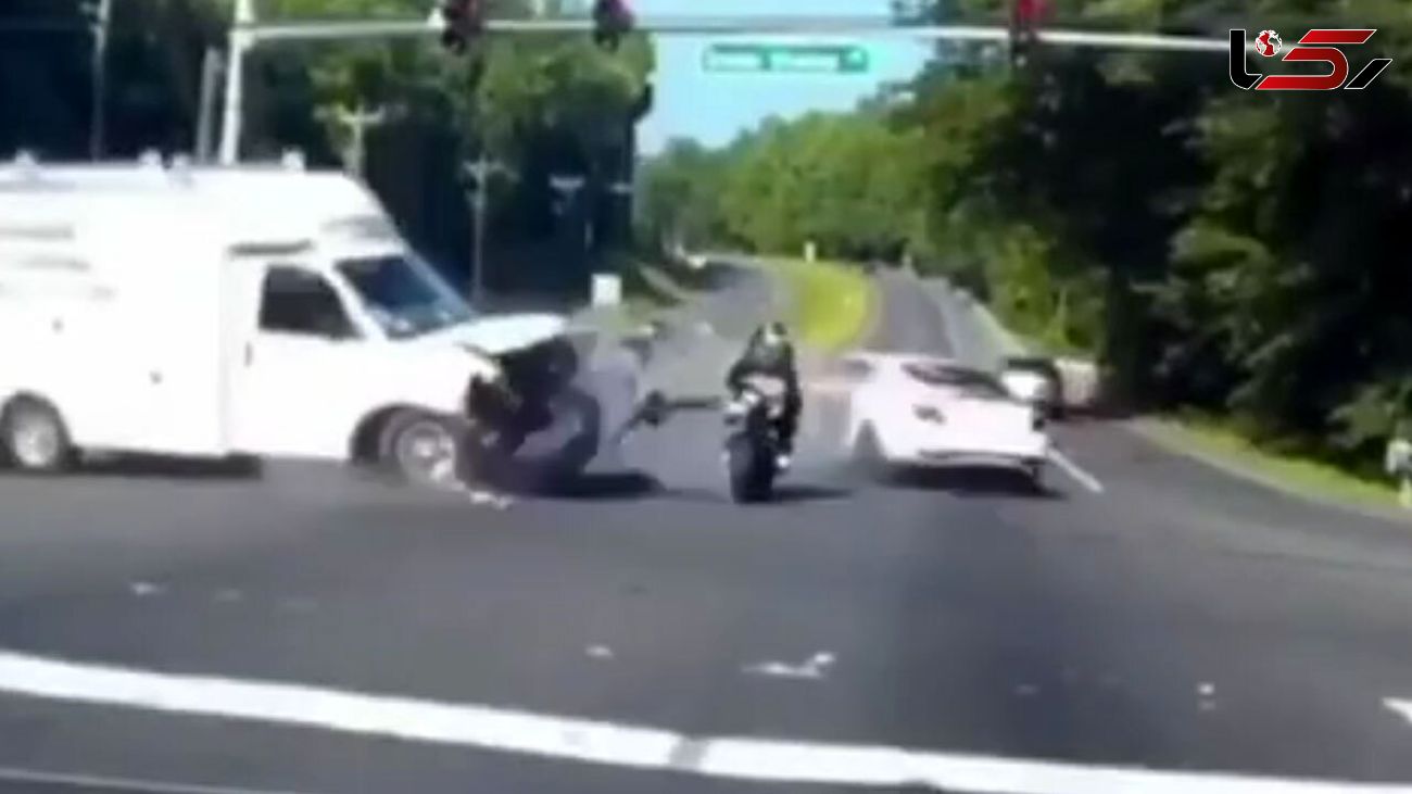فیلم لحظه نجات معجزه آسای موتورسوار از مرگ حتمی