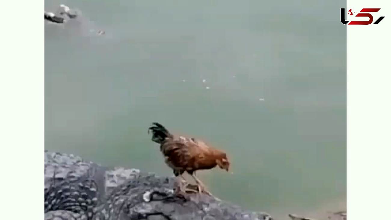 یک مرغ که در حال قدم زدن با خونسردی بود از سوی یک تمساح وحشت زده شد.