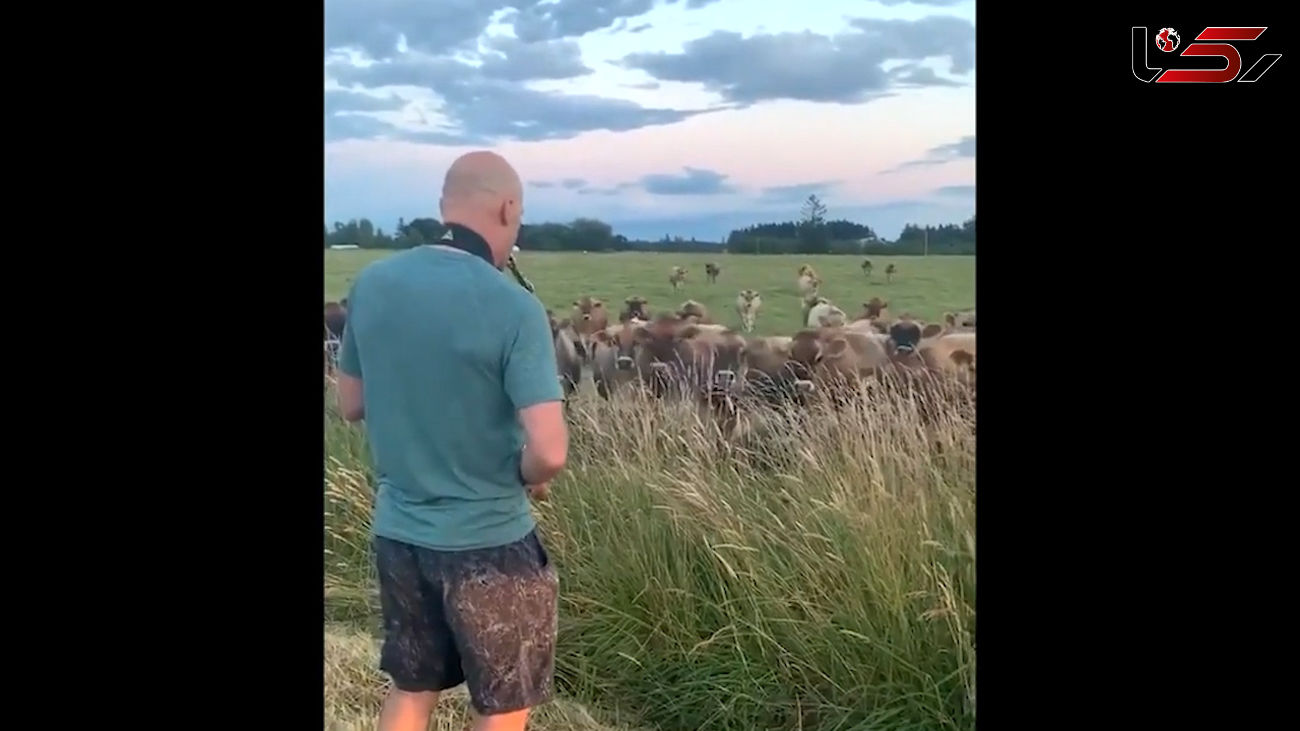 به گزارش رکنا ، در این فیلم مشاهده می کنید که یک گله گاو در حال حرکت در مزرعه ای بودند که این نوازنده اقدام به نواختن ساکسوفن می کند.