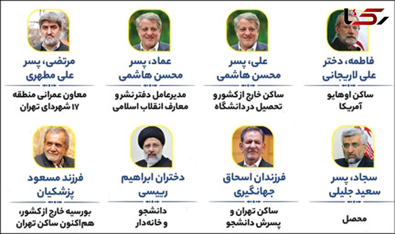 به گزارش رکنا، در این اینفوگرافی آمده فرزند علی لاریجانی در آمریکا زندگی می کند، فرزندان محسن هاشمی ؛ یکی از پسرانش مدیرعامل دفتر نشر و معارف انقلاب اسلامی است و پسر دیگر آقای هاشمی در خارج از کشور مشغول ادامه تحصیل است. فرزند سعید جلیلی در داخل کشور در حال تحصیل است و پسر علی مطهری هم اکنون معاون عمرانی منطقه 17 شهرداری تهران است.