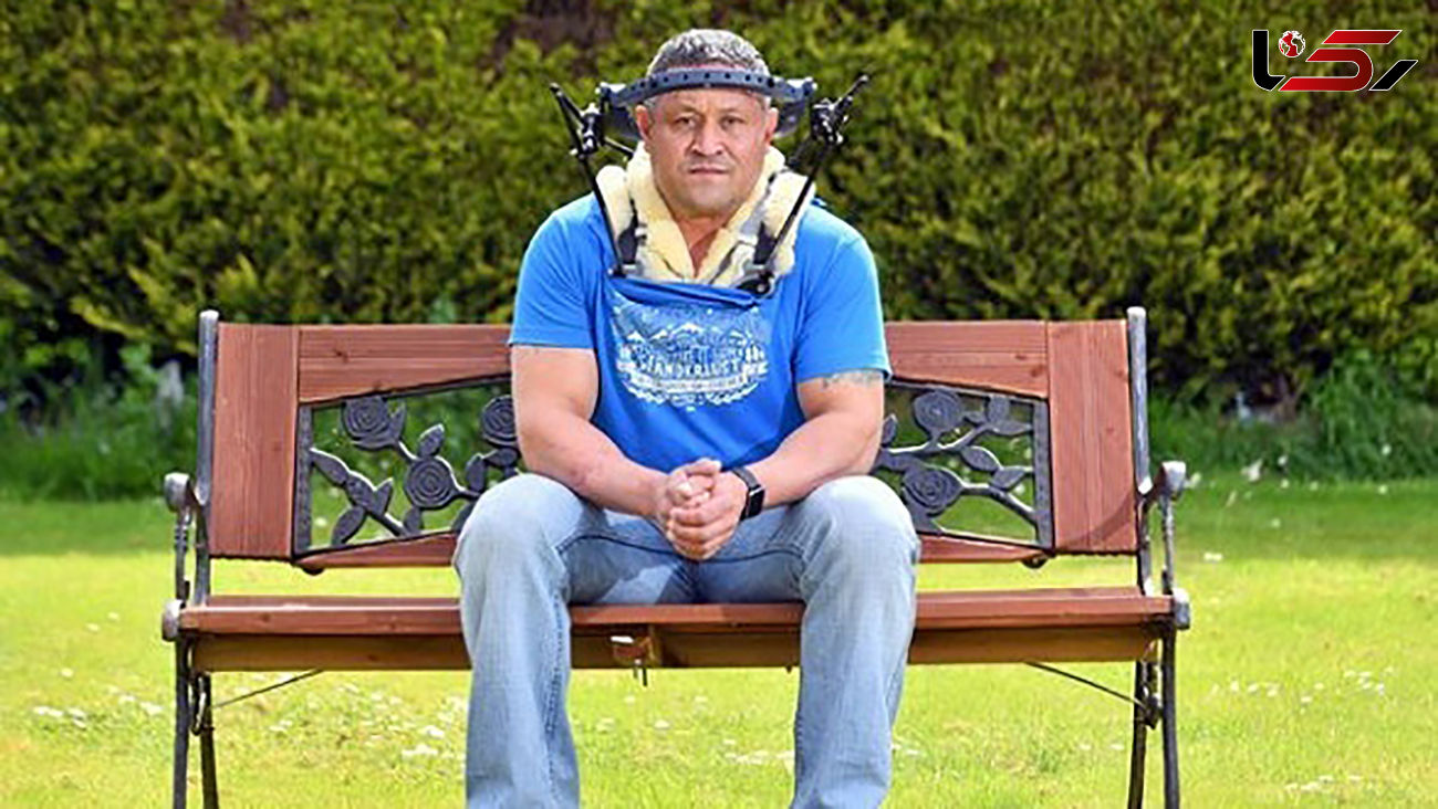 یک مرد انگلیسی پس از حادثه ای که برایش پیش آمده مجبور است از حلقه ای فلزی برای اتصال گردن به جمجمه استفاده کند.