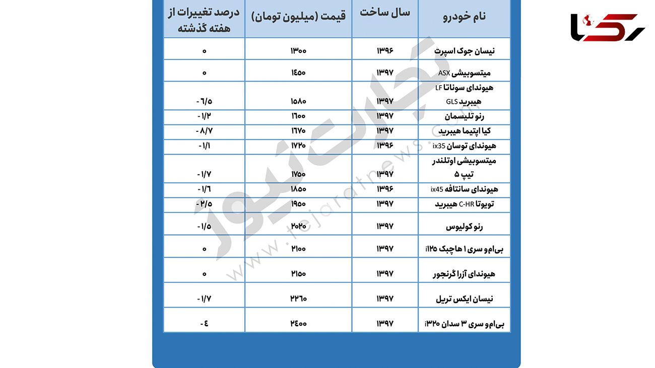 خودروهای کیا اپتیما هیبرید ، هیوندای توسان ix35 و میتسوبیشی اوتلندر تیپ ۵ در محدوده قیمتی یک میلیارد و ۶۰۰ میلیون تا یک میلیارد و ۷۰۰ میلیون معامله میشوند.