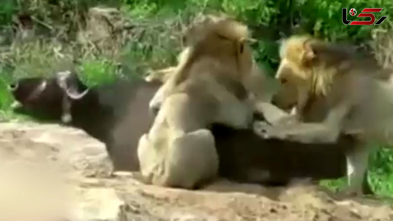 حمله گروهی شیرها به گاومیش نگون بخت + فیلم