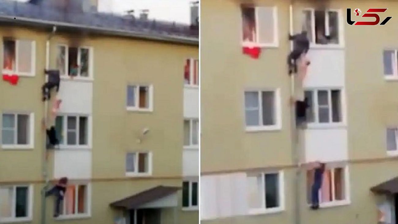 به گزارش رکنا، ویدئویی که توسط یکی از همسایگان و با تلفن همراه تهیه شده اقدام قهرمانانه این افراد را نشان میدهد. در این ویدئو در حالی که دود غلیظی از داخل ساختمان بیرون میآید مشاهده میشود آنها با بالارفتن از لوله فاضلاب خود را به کودکان میرسانند. این ویدئو نشان میدهد آنها با کمک یکدیگر این کودکان را از طبقه سوم ساختمان به پایین منتقل میکنند.