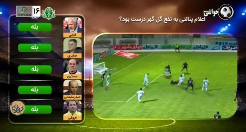 در برنامه فوتبال برتر اما سه کارشناس داوری نظراتی کاملا متفاوت ارائه دادند و هر سه به ادامه بازی و صحیح نبودن پنالتی اعلام شده برای گلگهر معتقد بودند. سعید مظفری زاده در این برنامه گفته: هند نبود و خطای مهاجم باید اعلام میشد. احمد صالحی هم به ادامه بازی و خطا نبودن صحنه اشاره داشت و همچنین یدالله جهانبازی هم گفت: توپ به دست بازیکن مدافع میخورد و چون مدافع به صحنه نزدیک است ادامه بازی و هند درست نیست.