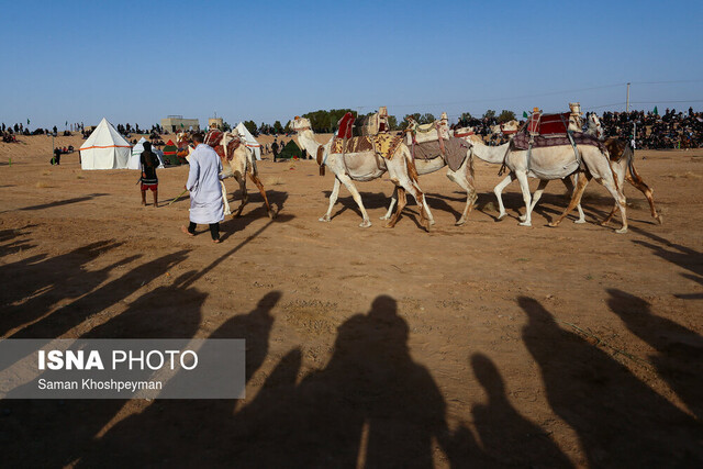 در آغاز مراسم، کاروانی از اولیا، حرکت می کند که در میانه راه، لشکر اشقیا راه بر آنها میبندند. حربن یزید ریاحی، پیشاپیش این سپاه ایستاده است. عمر بن سعد با سپاهش سایه به سایه کاروان حسینی را تعقیب میکند و شمر بن ذیالجوشن، که مأمور بود او را به جنگ با فرزند رسول خدا، بفرستد نیز حضور دارد.