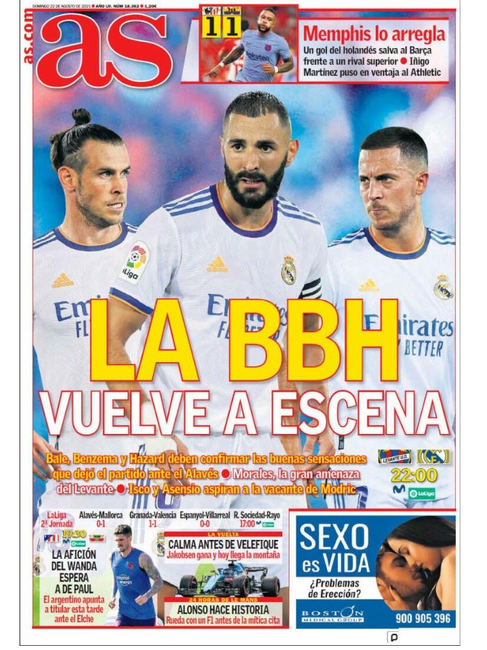 تیتر و عکس صفحه نخست روزنامه آاس به بازگشت دوباره مثلث BBH به صحنه در بازی امشب اختصاص دارد