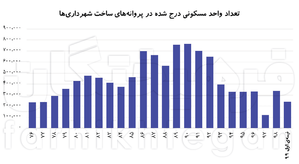 افزایش 6برابری قیمت در طول هشت سال یکی از تکانههای صنعت مسکن بوده است. گزارش مرکز آمار از تعداد پروانههای ساختوساز که توسط شهرداریهای کل کشور صادر شده است، نشان میدهد در طول هشت سال رکود عمیقی در ساختوساز در صنعت مسکن حاکم بوده است. تجمیع آمار هشت سال و مقایسه دولتهای مختلف نیز نشاندهنده رکود و کمکاری دولت یازدهم و دوازدهم در صنعت مسکن است. بهعنوان مثال حدفاصل سالهای 1369تا 1376 یک میلیون و 170هزار واحد مسکونی در کشور ساخت شده، این عدد برای حدفاصل سالهای 1377تا 1384 دو میلیون و 120هزار واحد و برای بازه زمانی 1385تا 1392 چهار میلیون و 800هزار واحد بوده است، درحالیکه در هشت سال گذشته علیرغم افزایش جمعیت و ورود پیک جمعیتی دهه شصت به متقاضیان مسکن تنها دو میلیون و 500هزار واحد مسکونی در کشور ساخته شده است.