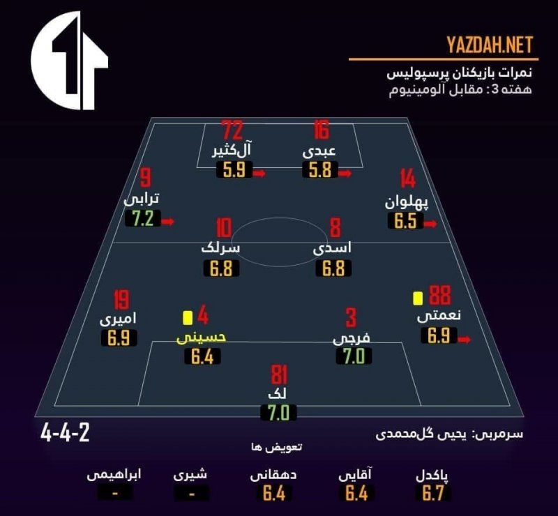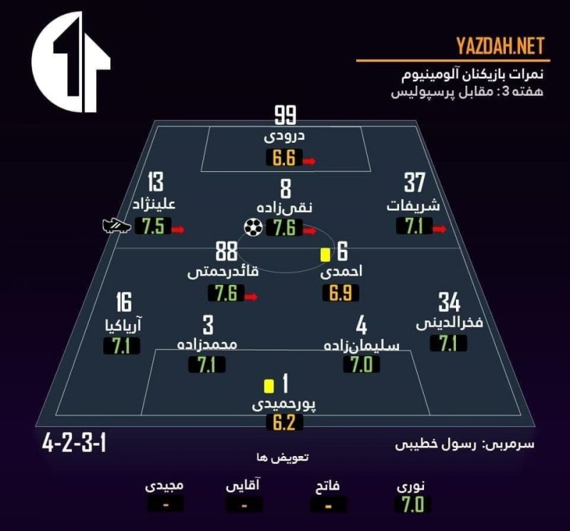 آمار بازی نشان می دهد فقط سه بازیکن یحیی نمره بالای ۷ گرفتهاند ولی ۸ نفر از شاگردان خطیبی نمره دریافتیشان بالاتر از ۷ بود و چهار نفر دیگر خیلی نزدیک به این نمره بودند. بازی با برنامه تیم آلومینیوم که به دلیلی مشکلات فیلم برداری دقایق اولیه آن خوب دیده نشد تا دقیقه ۹۴ بازی و سوت پایان بازی ادامه داشت و آنها توانستند نه تنها پرسپولیس را در نتیجه بازی مغلوب کنند، بلکه در بازی خوانی و تفکر تیمی، دفاع منطقه ای و تیمی، حملات و ضد حملات و پوش مناطق بازی نیز برتر باشند و در برابر این تیم دبل کنند. اتفاقی که خطیبی و شاگردانش لیاقت آن را داشتند تا از برد فصل قبل خود نیز دفاع کنند.