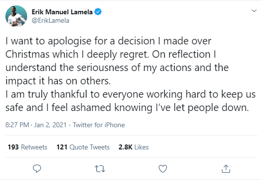 اریک لاملا در صفحه خود نوشت: "می خواهم بابت کاری که در ایام کریسمس انجام دادم ابراز تاسف عمیق خود را ابراز کرده و عذرخواهی کنم. حالا به طور کامل متوجه تبعات کار خود و تاثیر آن بر دیگران شده و این مسئله را درک کرده ام. من واقعا از همه کسانی که برای حفظ امنیت ما سخت تلاش می کنند سپاسگزاربوده و از اینکه مردم را ناامید کرده ام احساس شرمندگی می کنم."