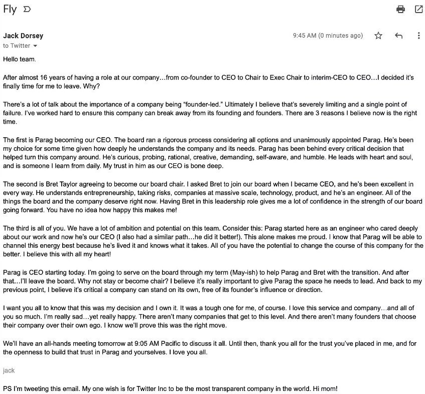 دورسی در ایمیلی به کارمندان توییتر اعلام کرد به دلیل قدرت رهبری آگراوال، انتصاب برت تایلور، مدیر عملیاتی سلزفورس به عنوان رییس هیات مدیره جدید و اعتماد به بلندپروازی و پتانسیل کارمندان توییتر، تصمیم گرفت از سمتش کناره گیری کند. وی نوشت: «من واقعا ناراحت و در عین حال بسیار خوشحال هستم. شرکتهای زیادی نیستند که به این سطح برسند. دورسی خاطرنشان کرد که اقدام به کناره گیری تصمیم خودش بوده است.»