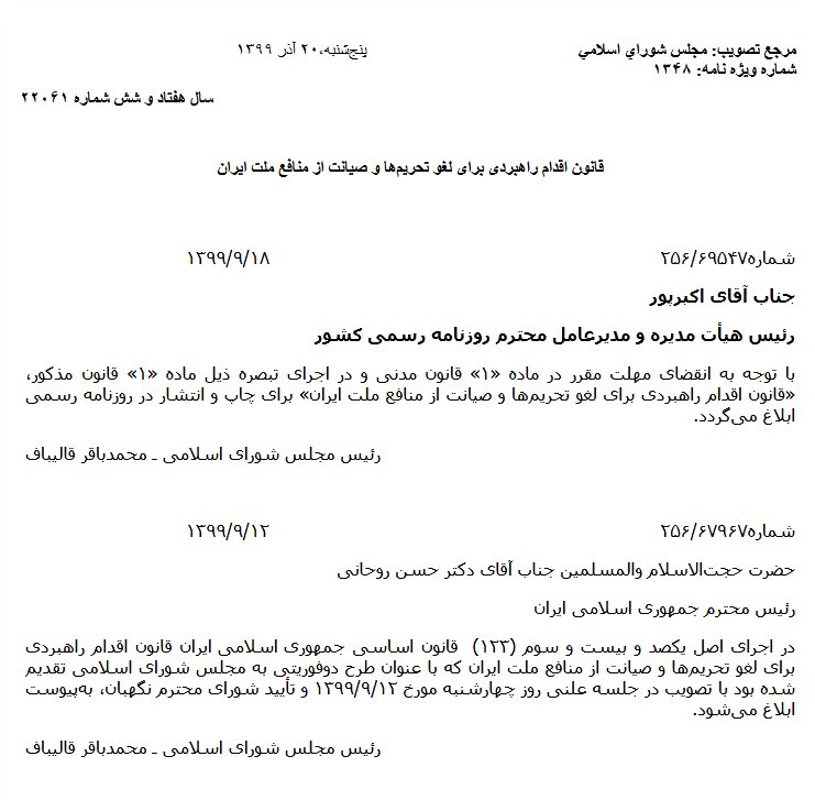 این ماجرا در ارتباط با قانون «اقدام راهبردی برای لغو تحریمها» نیز اتفاق افتاد و قالیباف طی نامهای به رئیس هیئت مدیره و مدیرعامل روزنامه رسمی کشور، این قانون را وفق تبصره ماده «۱» قانون مدنی ابلاغ و دستور انتشار آن را در این روزنامه را صادر کرد.