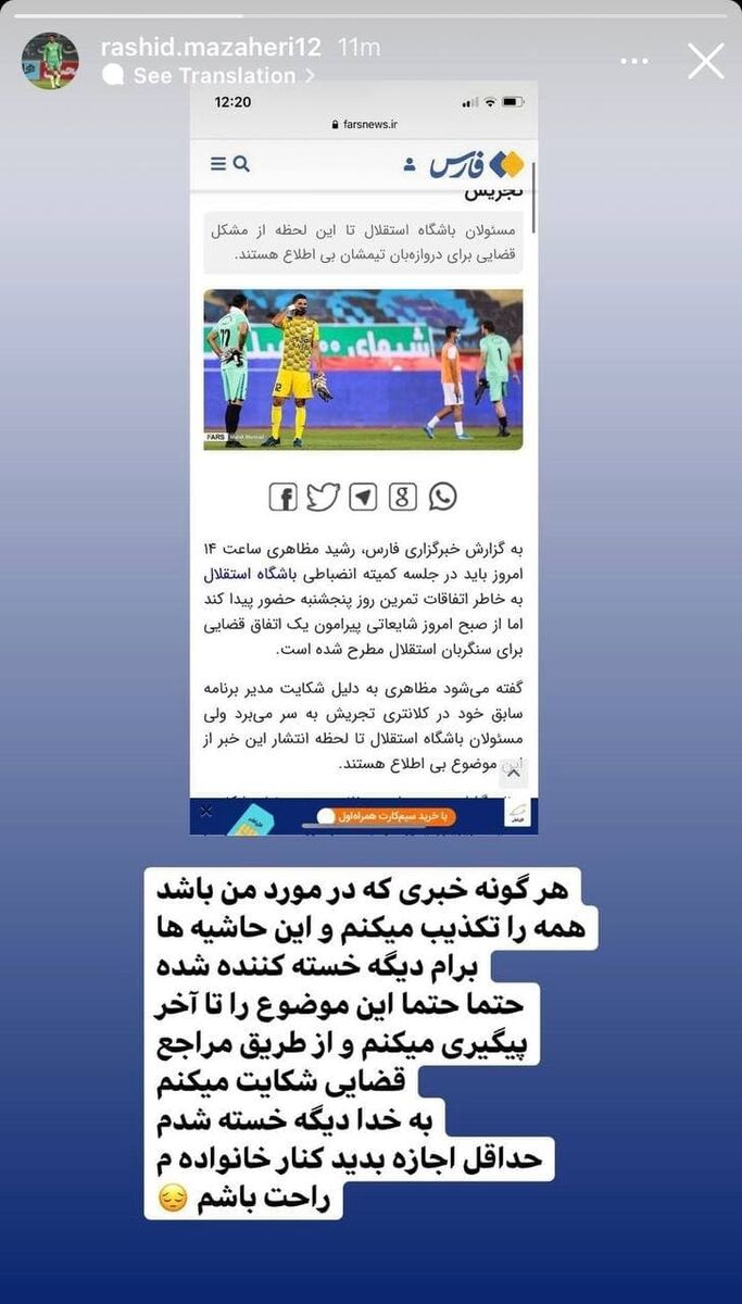 رشید مظاهری دروازه‌بان تیم فوتبال استقلال با اعلام رسمی این باشگاه به دلیل آنچه که مسئله انضباطی اعلام شد، در اختیار کمیته انضباطی باشگاه قرار گرفت. همچنین در برخی از خبرها آمده بود که به دلیل شکایت مدیربرنامه‌های مظاهری این دروازه‌بان در کلانتری تجریش حاضر شده است.