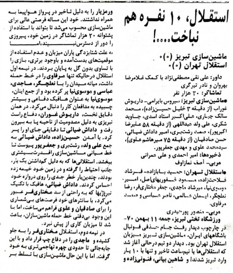 جاماندن سه بازیکن استقلال به نام های شاهین بیانی ،مهدی فنونی زاده و صادق ورمزیار از پرواز تهران به تبریز و تیم کم مهره آن روز منصور پورحیدری باعث شد این تیم با ده بازیکن بازی را آغاز کند و با همان ده بازیکن تا پایان بازی ادامه دهد.