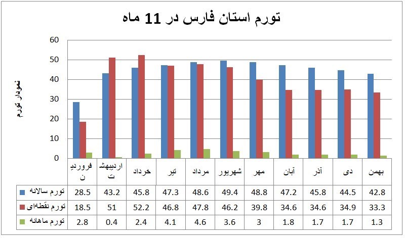 مقایسه آماری 11 ماهه تورم استان فارس نشان میدهد که افزایش قیمت کالاها در این استان با کاهش همراه بوده است. تورم سالانه استان فارس در فروردین ماه 28.5 درصد، در اردیبهشت ماه 43.2 درصد، در خردادماه 45.8 درصد، در تیرماه 47.3 درصد، در مردادماه 48.6 درصد و در شهریورماه نیز به 49.4 درصد رسیده اما از مهرماه این تورم سیر نزولی به خود گرفته است.