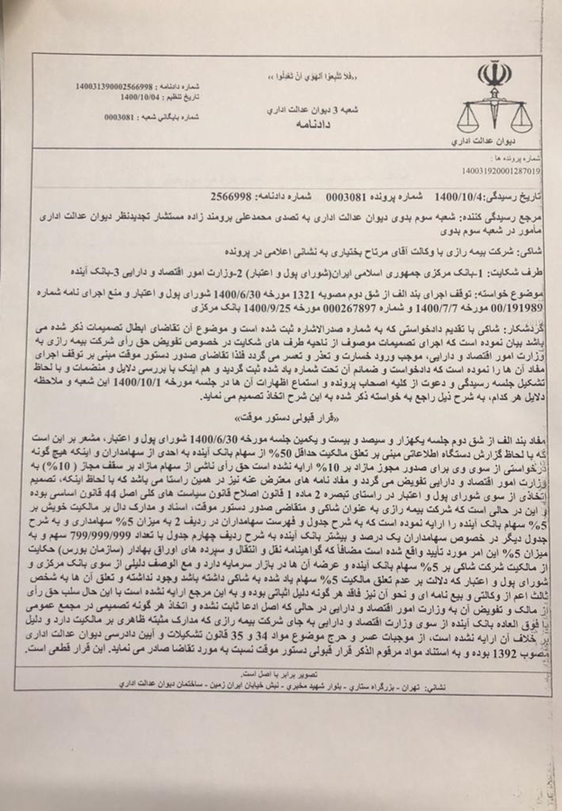 در توضیحات وزارت اقتصاد آمده است:بر اساس اطلاعات پرونده بانک آینده و تأیید بانک مرکزی جمهوری اسلامی، ابلاغیه بانک مرکزی در تفویض اختیار رأی مالک واحد سهام بانک آینده در تاریخ ۴ دیماه ۱۴۰۰ توسط دیوان عدالت اداری با دستور موقت (برابر تصویر زیر) تعلیق شده است.