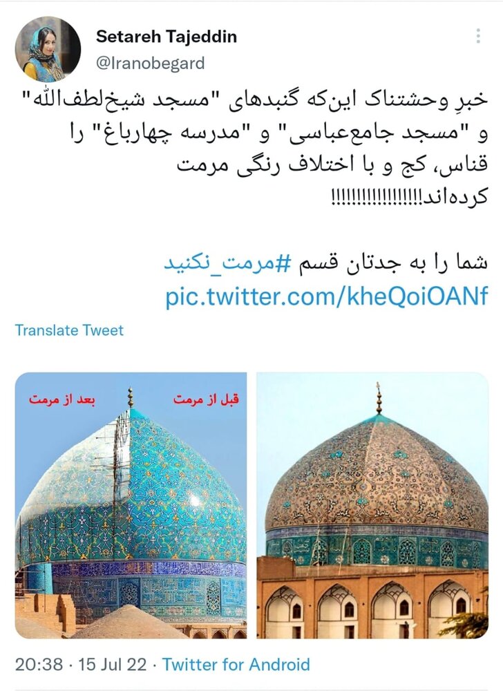 تصاویر منتشر شده در شبکه های اجتماعی نشان می دهد گنبد مسجد شیخ لطف الله که دارای نقوش و اسلیمی های منحصر به فرد و رنگ خاص کرمی و شتری است، با مرمت غیراصولی اخیر، کاملا دوتکه شده است و خط مشخص و ضخیمی، بخشهای مختلف نقوش گنبد را جدا کرده است.
