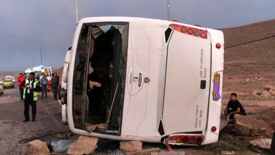 لحظاتی پیش یک دستگاه اتوبوس حامل زائران اربعین در محور ایلام به مهران به علت ترکیدگی لاستیک واژگون شد.