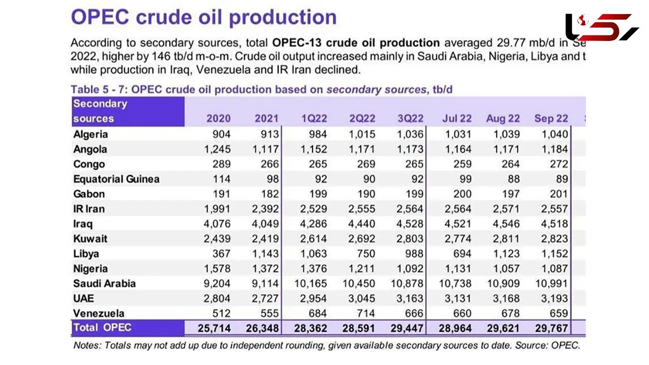 تازهترین گزارش ماهانه اوپک همچنین حاکی از آن است که تولید نفت ایران در ماه سپتامبر 14 هزار بشکه در روز کاهش یافته و به 2 میلیون و 557 هزار بشکه رسیده است.