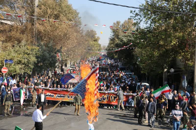به گزارش خبر نگار ایرنا، تجمع ۱۳ آبان از ساعت ۱۰و ۳۰دقیقه صبح امروز جمعه با حضور مردم ولایتمدار شهرستان از جمله؛ دانش آموزان، دانشجویان، روحانیون، روسا و کارمندان ادارات ، ورزشکاران، بسیجیان و دیگر اقشار پای بند به نظام و ولایت آغاز شده و شرکت کنندگان آمدند تا بار دیگر شعار مرگ بر استکبار سر دهند.