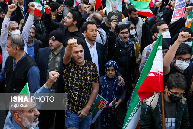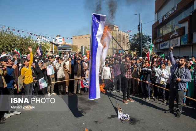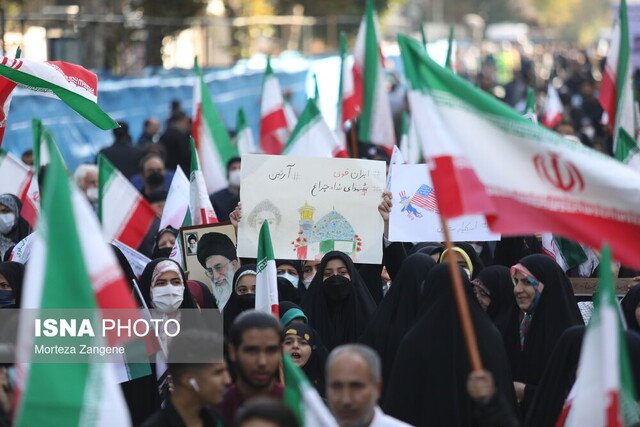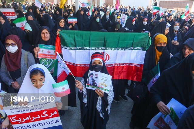 دانش آموزان و دانشجویان با حضور پرشور خود و با آتش کشیدن پرچمهای آمریکا و اسرائیل خشم و انزجار خود را از اقدامات دولت خبیث آمریکا و اسرائیل به تمامی جهانیان نشان دادند.