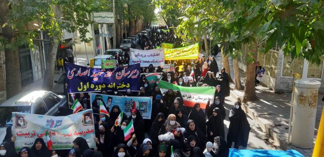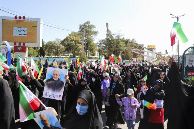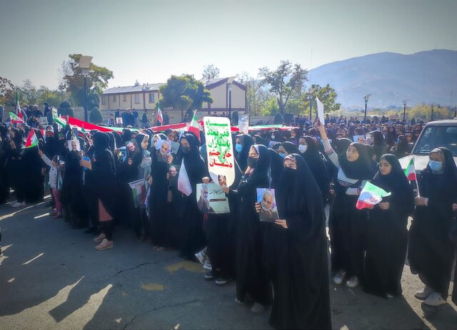 در این راهپیمایی که دانش آموزان دهه هشتادی و نودی حضوری پرشور و پر رنگ داشتند شعارهایی هم چون «مرگ بر آمریکا»، «مرگ بر اسرائیل»، «الله اکبر، خامنهای رهبر»، «جهاد تبیین، امروز یک تکلیف الهیست»، «بانی اغتشاشات، آمریکاست آمریکاست»، «سیزدهم آبانماه صلابت ملت است، روز شکست کفر و عزت این ملت است» و... سر دادند و عهد بستند که ادامه دهنده راه حاج قاسم سلیمانی و شهدا باشند.