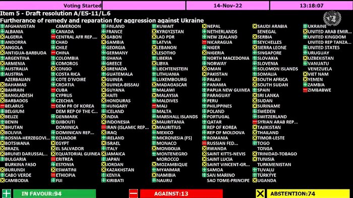 این قطعنامه که توسط ۹۴ کشور از ۱۹۳ عضو مجمع حمایت شد، اذعان می دارد که روسیه باید در قبال نقض قوانین بینالمللی در اوکراین پاسخگو باشد و "عواقب حقوقی تمام اقدامات نادرست بینالمللی خود از جمله جبران خسارت وارده را متحمل شود."